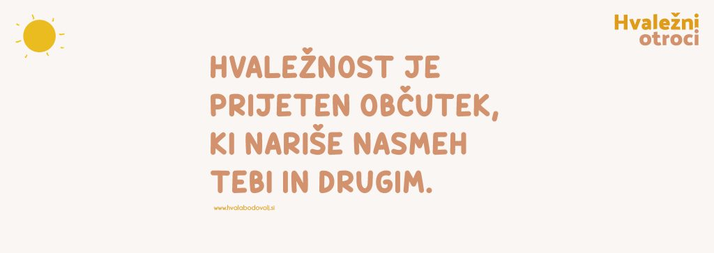 Hvaležnost je občutek, ki se rodi v nas, ko se počutimo prijetno ob tem, da nam kdo pomaga, da si nekdo vzame čas za nas, da nam kdo prisluhne, da nas stisne v objem ali pa da smo samo lahko ob njem.